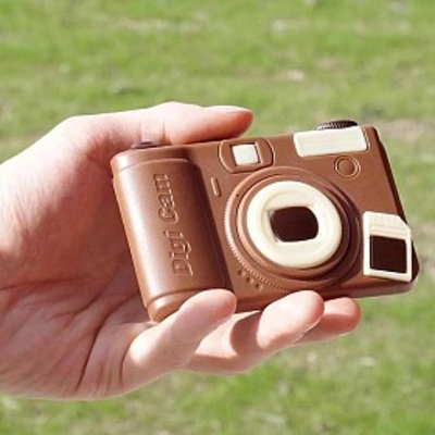 Esta cámara de fotos es muy fácil de usar... ¡solo dale un mordisco y disfruta! está hecha de chocolate con leche.