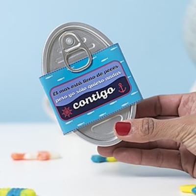 Dentro de esta lata de conservas encontrarás mucho amor en forma de peces de gominola.