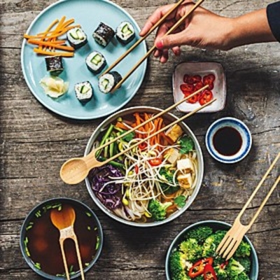 Para los multitarea o para principiantes en comida oriental: estos palillos llevan un tenedor y una cuchara en su extremo superior.
