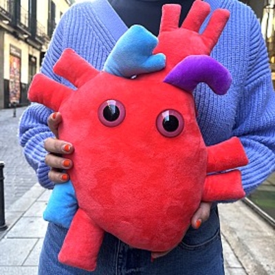 Achucha este amoroso peluche con forma de corazón anatómico y cuatro mini peluches extraíbles de componentes de la sangre.