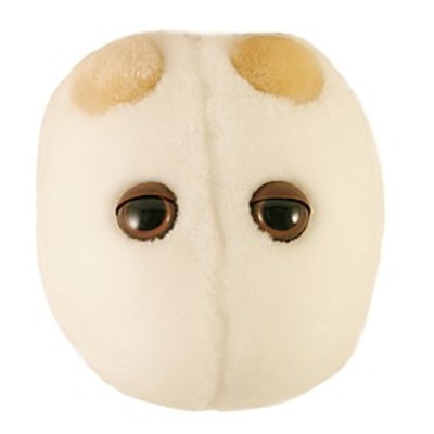 Este microbio de peluche es un millón de veces más grande que uno real. Es blandito, tiene ojos y es de color blanco.