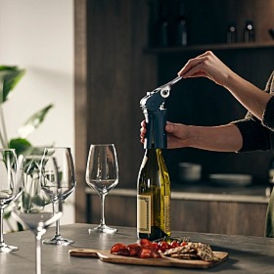 Toda la potencia de un sacacorchos de palanca en un diseño compacto con cortacápsulas integrado.