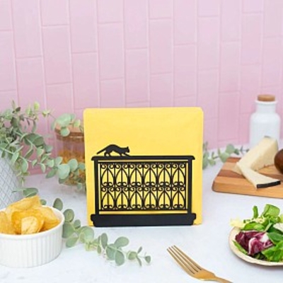 Pon un toque original a la decoración de tu mesa con este original servilletero, tiene la forma de un balcón con un gatito paseando sobre el.