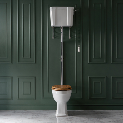 Cree un look sin igual gracias a este inodoro monobloque con diseño elevado de la gama Richmond completo con, inodoro alto tapa de color roble con cierre amortiguado, cisterna, con soportes, tubo de descarga y cadena de descarga. El conjunto de inodoro tradicional de la gama Richmond incluye un kit de descarga disponible en distintos acabados
