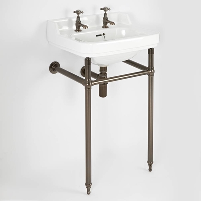 Agregue un elegante punto de enfoque a su baño gracias a este elegante conjunto con consola y lavabo de 560mm de la gama Richmond. Viene completo con una estructura metálica para lavabo con acabado de color oro cepillado y un lavabo realizado de cerámica. Este conjunto es ideal para asegurar crear un look clásico muy elegante. El lavabo ha sido realizado de cerámica de alta calidad y cuenta con un acabado extremadamente duradero que es muy fácil de limpiar. El lavabo viene predispuesto con dos agujeros para la grifería y cuenta con un amplio espacio de lavado. Combine con la colección de grifos de lavabo tradicionales con acabado efecto bronce bruñido para crear un look tradicional y coordinado. Características del Conjunto de Lavabo con Consola Richmond: Dimensiones: ancho 560mm x prof. 450mm x alto 885mm Lavabo especialmente diseñado para personas altas o con movilidad reducida Altura máx. 945mm (incluyendo el lavabo)