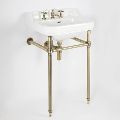 El lavabo y consola para lavabo de 560mm de la gama Richmond aportará un elegante estilo vintage a su cuarto de baño. Por ello es perfecto para crear un punto focal y gracias a su diseño atemporal, nunca pasará de moda. La consola para lavabo ha sido realizada en acero inoxidable y este modelo cuenta con un acabado de color oro cepillado. El lavabo ha sido realizado de cerámica de alta calidad y cuenta con un acabado extremadamente duradero que es muy fácil de limpiar. El lavabo viene predispuesto con tres agujeros para la griferÃa y cuenta con un amplio espacio de lavado. Combine con la colección de grifos de lavabo tradicionales de 3 agujeros con acabado efecto oro cepillado para crear un look tradicional y coordinado. CaracterÃsticas del Conjunto de Lavabo con Consola Richmond: Dimensiones: ancho 560mm x prof. 450mm x alto 885mm Diseño elevado