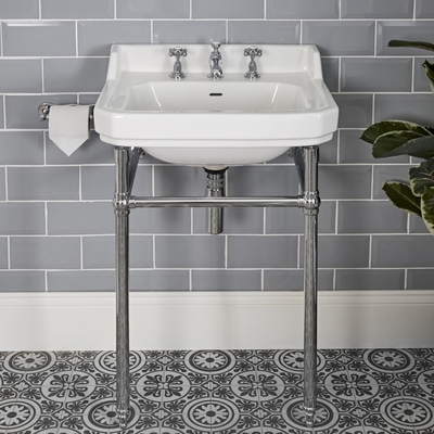 Las elegantes y clásicas líneas del lavabo consola en cerámica caracterizan un elegante lavabo suspendido en cerámica con estructura de soporte metálica en acero inoxidable. Este conjunto clásico de lavabo y pies de soporte en estilo retro son la forma perfecta para crear un lujoso look, ahorrar espacio y la estructura es perfecta para colgar toallas. Características: Barras para colgar toallas. Lavabo en cerámica blanca. Lavabo con tres agujeros para grifería.NB: El lavabo no incluye grifería, válvula de desagüe o sifón de botella. Estilo tradicional. Dimensiones: Anch x Alt x Pro: 560mm x 885mm x 450m. La estructura metálica requiere ser cortada a medida Garantía: 20 años.