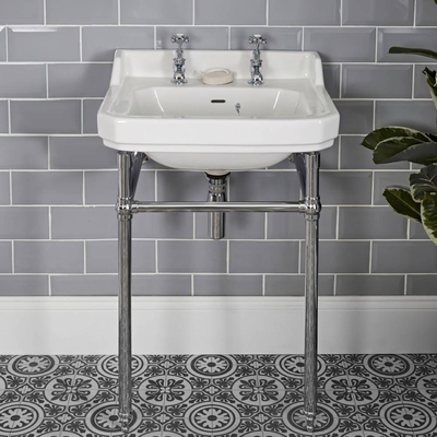 Las elegantes y clásicas líneas del lavabo consola de cerámica caracterizan un elegante lavabo suspendido de cerámica con estructura de soporte metálica de acero inoxidable. Este conjunto clásico de lavabo y pies de soporte en estilo retro son la forma perfecta para crear un lujoso look, ahorrar espacio y la estructura es perfecta para colgar toallas. Características: Incluye barra portatoallas Lavabo de cerámica blanca Lavabo con 2 agujeros para grifería NB: El lavabo no incluye grifería o sifón de botella Estilo tradicional Dimensiones: Anch x Alt x Pro: 560mm x 885mm x 450m La estructura metálica requiere ser cortada a medida Los modelos con grifería para 2 agujeros disponen de un agujero para el tapón con cadena Garantía: 20 años