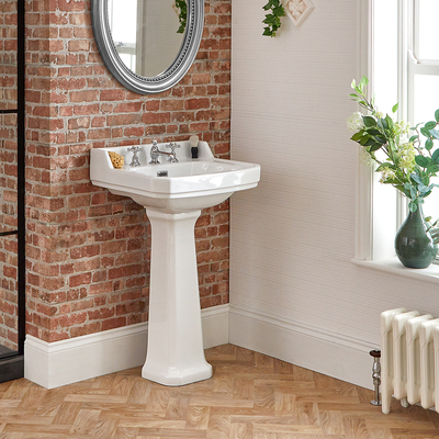 Embellezca su cuarto de baño mientras agrega estilo y función con este lavabo elevado con pedestal de 560mm de la gama Richmond.. La gama de lavabos Richmond se caracterizan por su diseño elevado y por ello, son perfectos para personas altas o con movilidad reducida y combina un diseño tradicional y función al mismo tiempo. El lavabo ha sido fabricado usando cerámica de la más alta calidad y tiene un esmaltado blanco que hace que sea extremadamente sencillo de limpiar. El lavabo elevado con pedestal de la gama Richmond cuenta con tres agujeros para la griferÃa para que pueda seleccionar entre nuestra fantástica gama de grifos para lavabo con tres agujeros en estilo tradicional y completar el look. Combine con otros artÃculos de la colección Richmond para garantizar crear un baño moderno y perfectamente coordinado. CaracterÃsticas del Lavabo Elevado con Pedestal Tradicional Richmond: Dimensiones: ancho 560mm x prof. 450mm x alto 954mm Diseño elevado