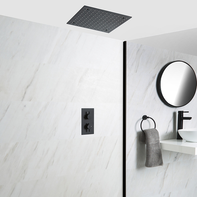 Agregue un look minimalista a su cuarto de baño con esta elegante alcachofa de ducha empotrable cuadrada de 400mm y la elegante llave de ducha mezcladora empotrable termostática de 1 salida. Su elegante acabado de color negro con acabado opaco complementará cualquier espacio decorado en estilo moderno. El cabezal de ducha empotrable ha sido diseñado para ser montado en cualquier techo o falso techo. Realizado de acero inoxidable, es resistente a la corrosión y tiene 121 hidrojets integrados para ofrecerle una experiencia refrescante en la ducha gracias a su diseño efecto lluvia. La llave de ducha mezcladora termostática empotrable ha sido realizada de latón macizo tiene un mando de control que le permite controlar el paso del agua y la temperatura a la vez. Realce el diseño de su espacio al combinar la colección de accesorios de la gama Nox. Descubra nuestra selección. Rogamos consulte los productos esenciales recomendados. Características: Diseño empotrable elegante perfecto para cre...