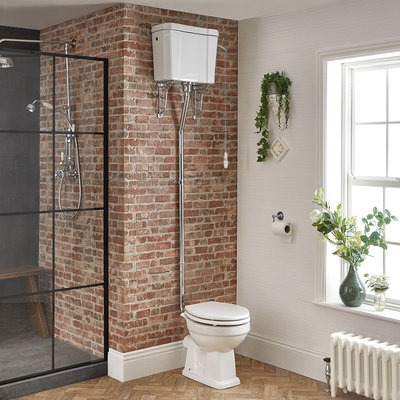 Un elegante conjunto tradicional con inodoro en cerámica de color blanco con una cisterna alta y cadena. Este conjunto será perfecto para crear un look tradicional en el cuarto de baño. La cisterna caracteriza un elegante look clásico con accesorios internos y el conjunto incluye la tapa del inodoro. Cisterna con accesorios incluidos y cadena en estilo tradicional. El inodoro deber ser instalado directamente al suelo. Inodoro y cisterna realizados en cerámica con tapa en MDF.