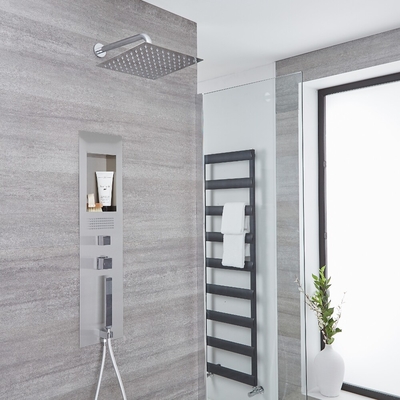 Si busca crear un baño de lujo este elegante panel de ducha hidromasaje completo con repisa, alcachofa de ducha 300mm, telefonillo, brazo mural e hidrojet le ofrece la selección perfecta para conseguirlo. Agregue un toque de clase a su cuarto de baño y manténgalo en orden con este elegante conjunto ducha completo con panel de ducha empotrable de diseño realizado de acero inoxidable, alcachofa de ducha de 300mm telefonillo, hidrojet y brazo de ducha de pared y con panel de ducha con repisa integrada. Los botones a presión le permiten utilizar distintas funciones de manera simultánea. Características del panel de ducha: Panel de ducha empotrable de 900x 220mm. Acabado: cepillado.