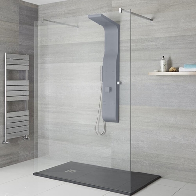 Un moderno panel de ducha hidromasaje de 3 funciones realizado de ABS con acabado de color antracita completo con alcachofa de ducha, 4 jets de ducha integrados y ducha de mano con flexo de ducha. Características: Panel de ducha (Anchura x Altura x Proyección): 207mm x 1400mm x 450mm. Seleccione debajo de la imagen principal para ver el dibujo técnico. Panel de ducha de ABS. Acabado: antracita. Mezclador de ducha manual de 3 funciones. Alcachofa de ducha integrada con efecto lluvia. 4 Jets de ducha integrados. Ducha de mano realizada de ABS cromado con flexo de ducha de 150cm. Este panel de ducha incluye conexiones flexibles para la manguera. Este panel de ducha incluye conectores flexibles para completar la instalación. Incluye un conjunto de tornillos de fijación para completar el montaje. Racores: ½”. Garantía: 10 años.