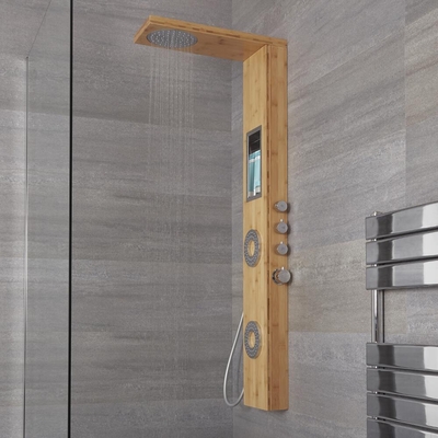 Un moderno panel de ducha hidromasaje de 3 funciones con acabado de color negro completo con alcachofa de ducha integrada repisa y ducha de mano con flexo de ducha. Características: Panel de ducha (Anchura x Altura x Proyección): 220mm x 1450mm x 540mm. Seleccione debajo de la imagen principal para ver el dibujo técnico. Acabado: bambú. Mezclador de ducha termostático de 3 funciones. Alcachofa de ducha integrada con efecto lluvia. Repisa integrada alto 240mm x ancho 150mm x profundo 75mm. Ducha de mano realizada de ABS cromado con flexo de ducha de 150cm. Este panel de ducha incluye conexiones flexibles para la manguera. Se recomienda una presión mínima de 1 y máxima de 4 bares para obtener un funcionamiento óptimo. Este panel de ducha incluye conectores flexibles para completar la instalación. Incluye un conjunto de tornillos de fijación para completar el montaje. Racores: ½”. Garantía: 10 años. Todas nuestras llaves incluyen discos de cerámica con tecnología moderna para un control precis...