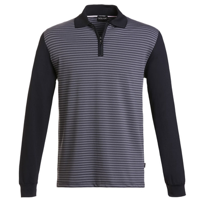 The men's long-sleeved dry comfort polo shirt will win you over with its thin stripes on the body & plain-coloured sleeve made from dry comfort jersey. The white ribbed collar looks very elegant thanks to the long black stripes. The personalised GOLFINO b&, metal zip pull & the woven label on the left side are further highlights.