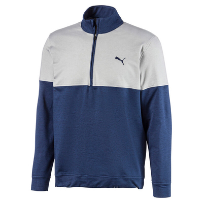 Play more comfortably in the wind with this modern styled mid-layer garment from PUMA Golf. Engineered with stretch performance fabrics to ensure you can move freely during the athletic movements of the golf swing. It offers warmth thanks to a brushed back fabric and has elasticated cuffs and hem to lock in your body warmth. The design features a 2-tone clour blocking with a half-zip opening for adjustable cooling, plus is highlighted with a PUMA Cat logo on the left chest.